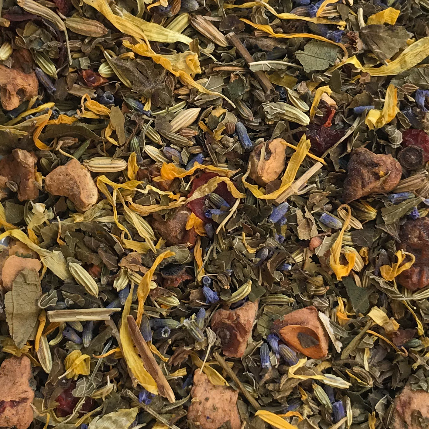 Ingredienti: melissa, mela, finocchio, anice, rosa canina, carvi, lavanda, calendula, foglie di mirtillo.