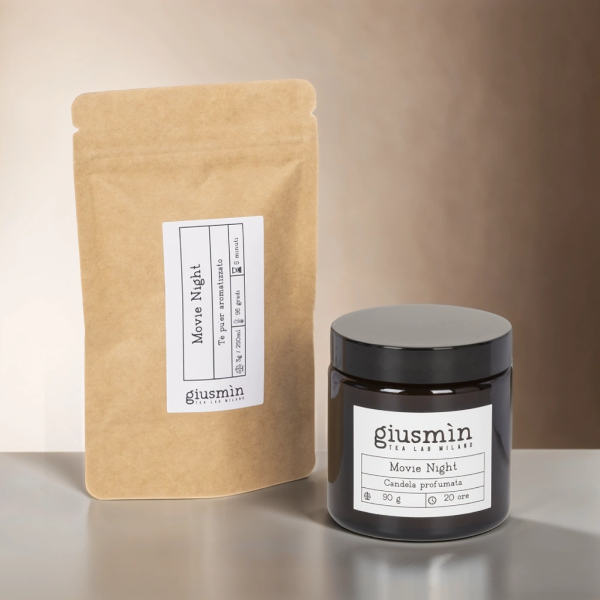 La candela ha un peso di 90g di cera, per circa 20 ore di durata della fiamma, è confezionata in un sacchetto di cotone pronto da regalare insieme a 12g di tè aromatizzato Movie Night.