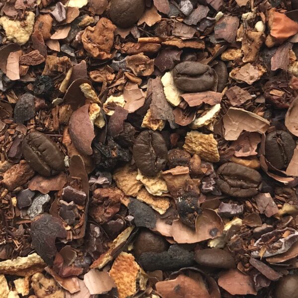 Ingredienti: rooibos, cubetti di mela arrostita, pezzi di fava di cacao, scorza di fava di cacao, scorza d’arancia, chicchi di caffè, scorza d’arancia, pezzi di cannella, ribes nero, aroma naturale, aroma.