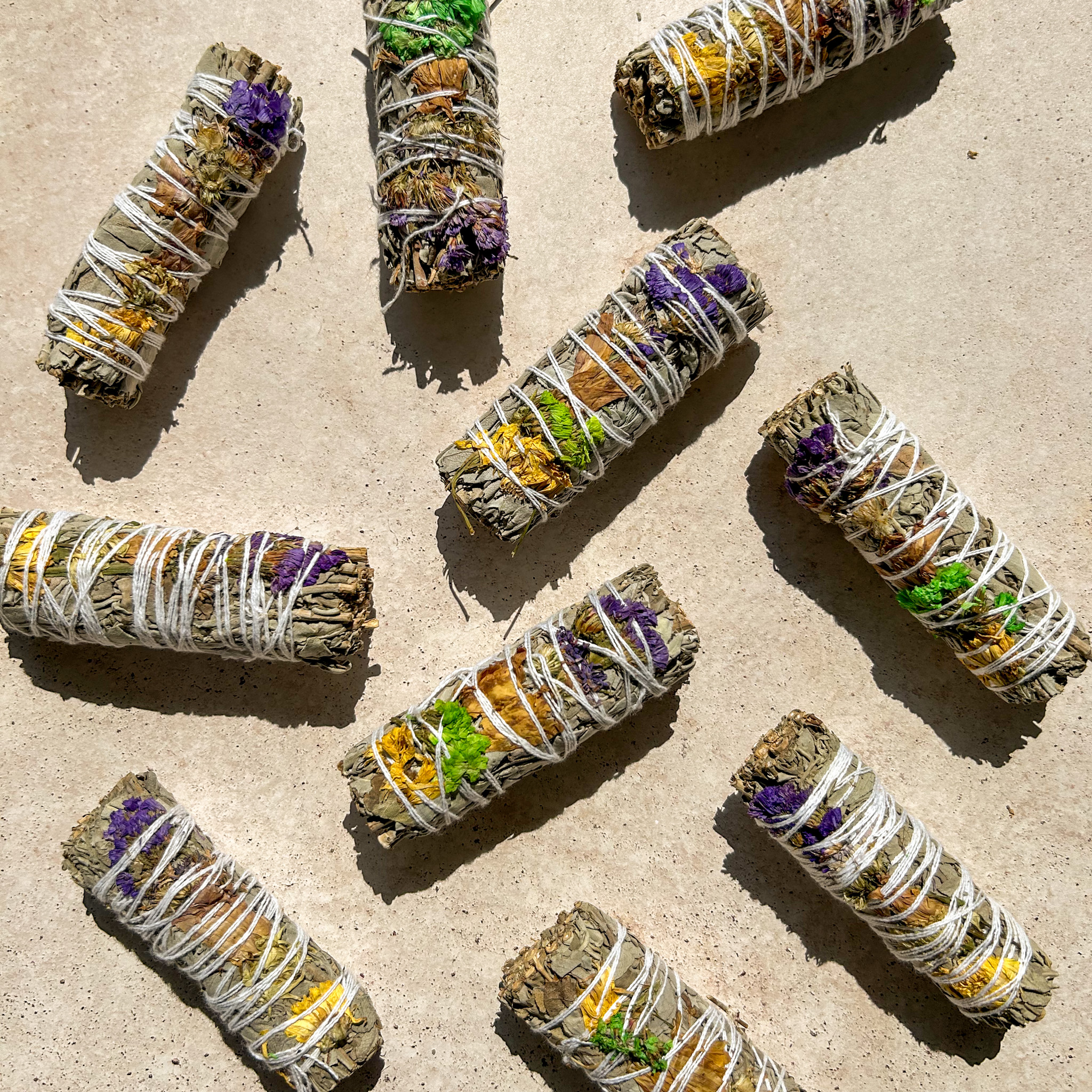 La Salvia Bianca è un tipo di salvia spontanea negli Stati Uniti e Messico, usata tradizionalmente in riti di purificazione degli ambienti bruciandone un’estremità, spegnendola e lasciando il suo fumo liberarsi nell’aria. Il profumo sprigionato è aromatico e affumicato ed è usato spesso anche nelle pratiche yoga e mindfulness. In questa versione, la torcia di salvia è stata arricchita di colorati fiori decorativi.