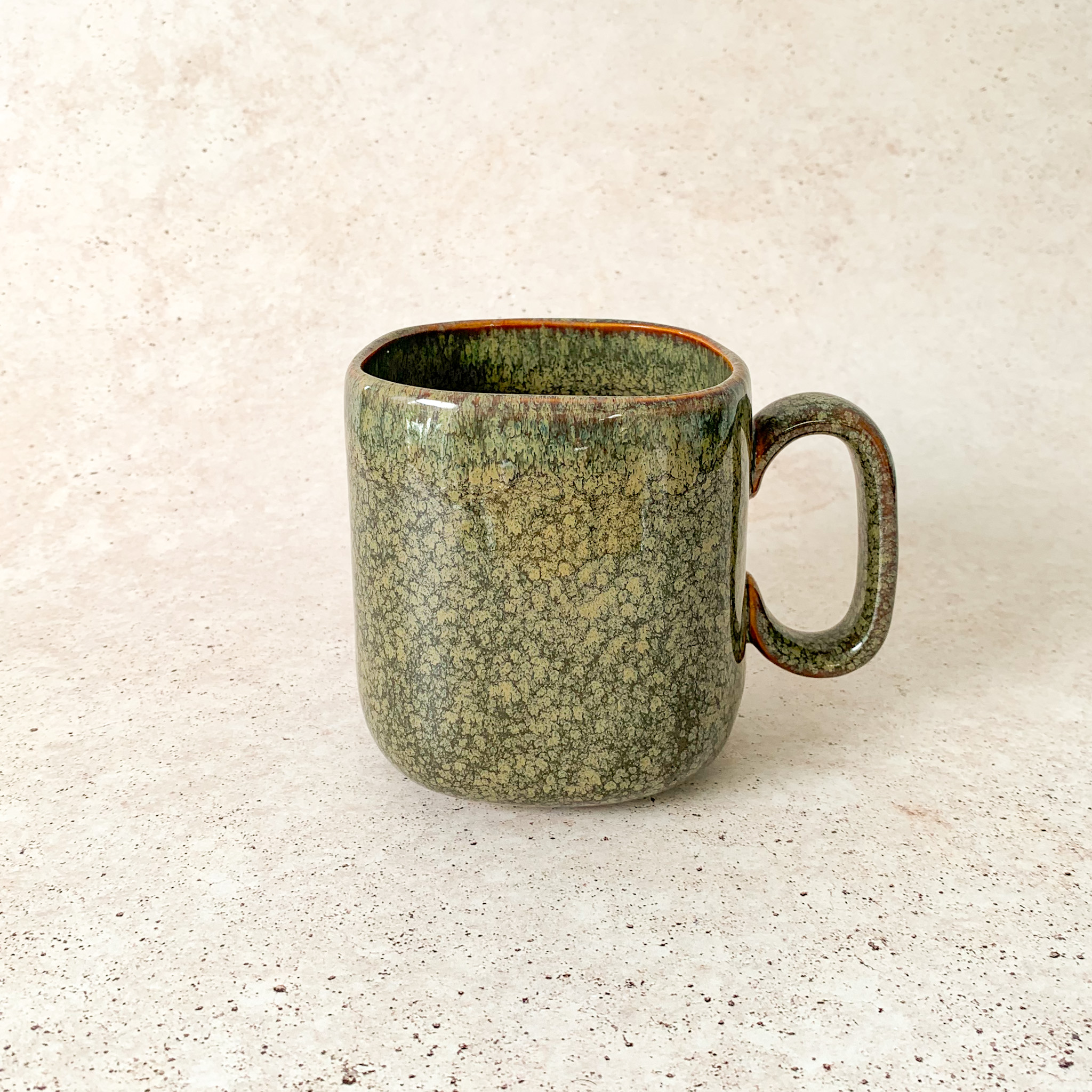 Tazza in ceramica con forma squadrata rifinita con “smalto reattivo” che rende unico l’assorbimento della luce e mette in risalto uno spettro di colori sfaccettato che varia dal marrone al grigio.