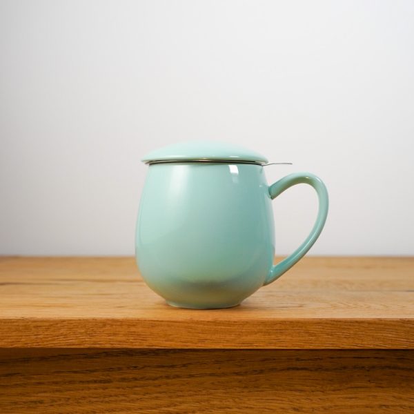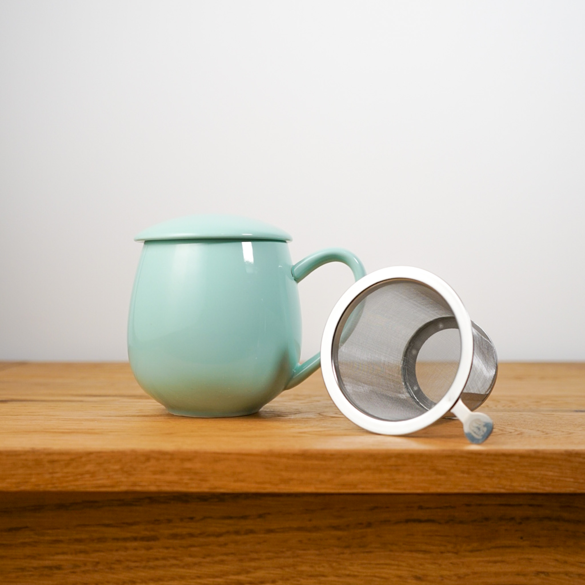 Tisaniera in porcellana. Kit 3 pezzi composto da tazza, filtro in acciaio e coperchio che può essere usato come piattino per il filtro al termine dell’infusione. Interno della tazza bianco per valorizzare il colore dell’infusione.