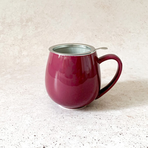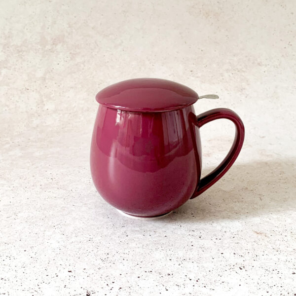 Tisaniera in porcellana. Kit 3 pezzi composto da tazza, filtro in acciaio e coperchio che può essere usato come piattino per il filtro al termine dell’infusione. Interno della tazza bianco per valorizzare il colore dell’infusione.
